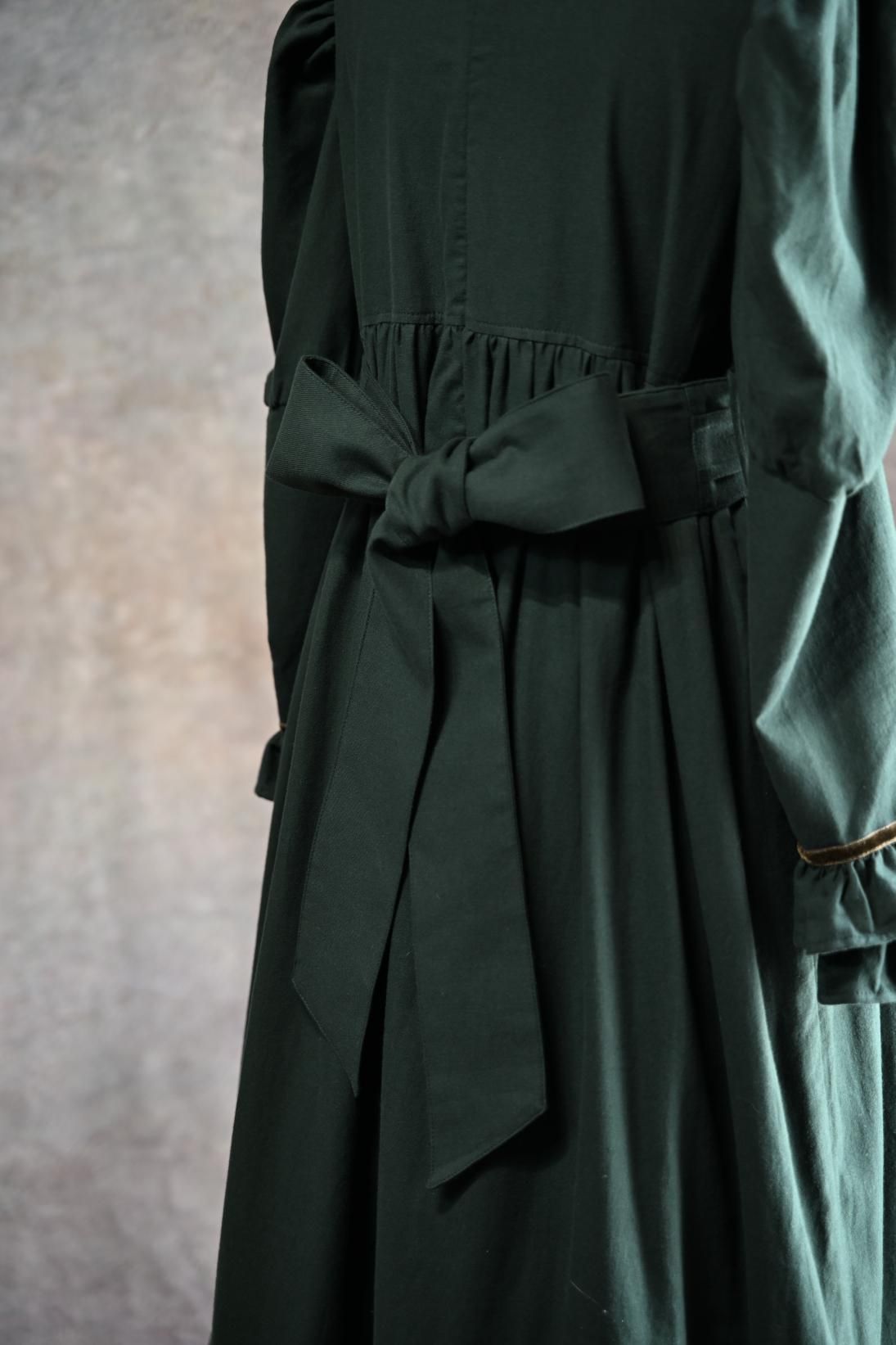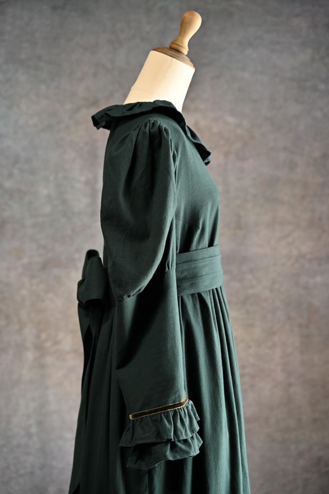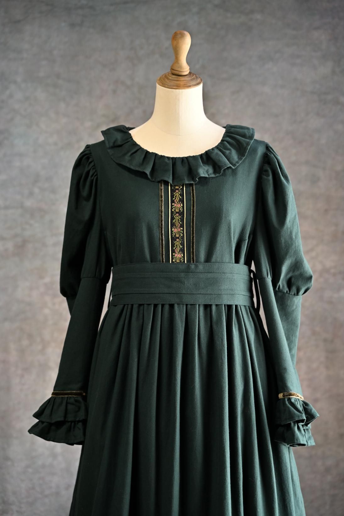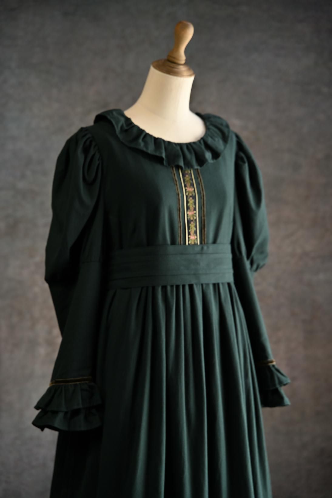 ヴィクトリア朝の画家、ケイト・グリーナウェイの描く世界と深まりゆく秋の森のイメージを重ねた合わせた物語性漂うドレス。グリーナウェイらしいハイウェストの切り替えにピンタックをほどこしたサッシュベルト、袖口に2段フリルとスカート裾には3段フリルが揺れます。深みのあるカラーに胸元の花籠柄のジャガードリボンが華やかさを添えて。軽く起毛したソフトであたたかいコットンビエラは秋冬にぴったりです。