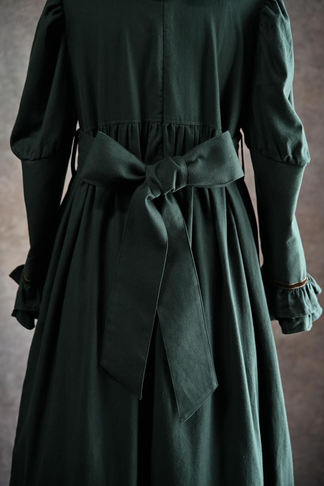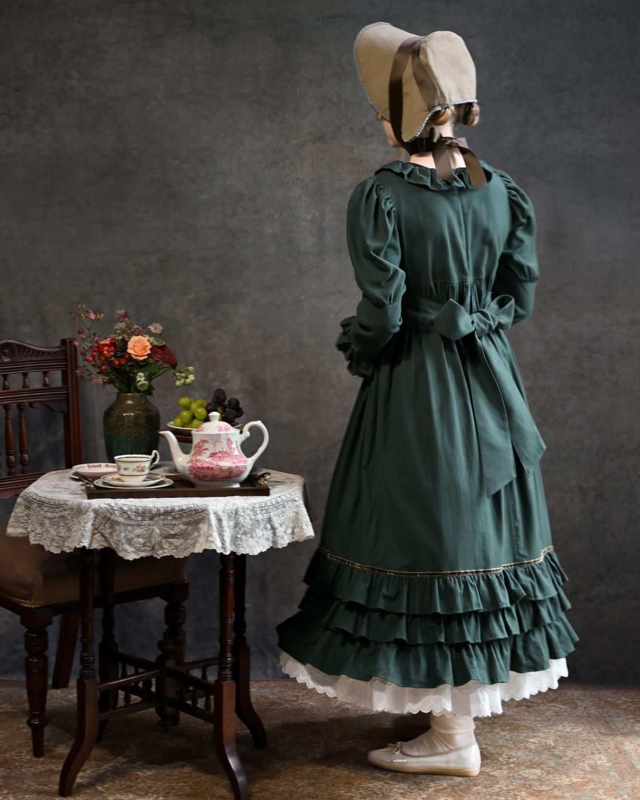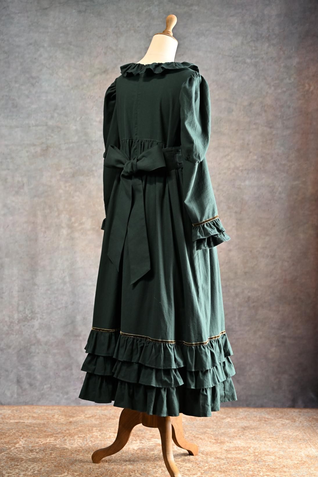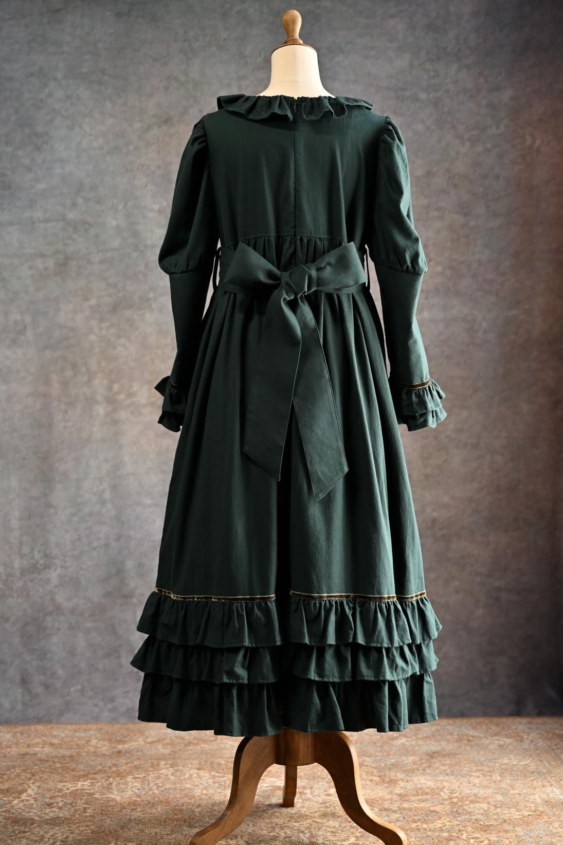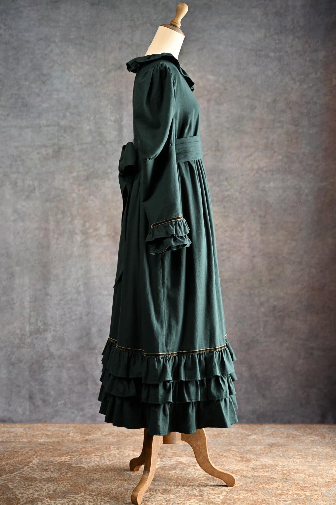 ヴィクトリア朝の画家、ケイト・グリーナウェイの描く世界と深まりゆく秋の森のイメージを重ねた合わせた物語性漂うドレス。グリーナウェイらしいハイウェストの切り替えにピンタックをほどこしたサッシュベルト、袖口に2段フリルとスカート裾には3段フリルが揺れます。深みのあるカラーに胸元の花籠柄のジャガードリボンが華やかさを添えて。軽く起毛したソフトであたたかいコットンビエラは秋冬にぴったりです。