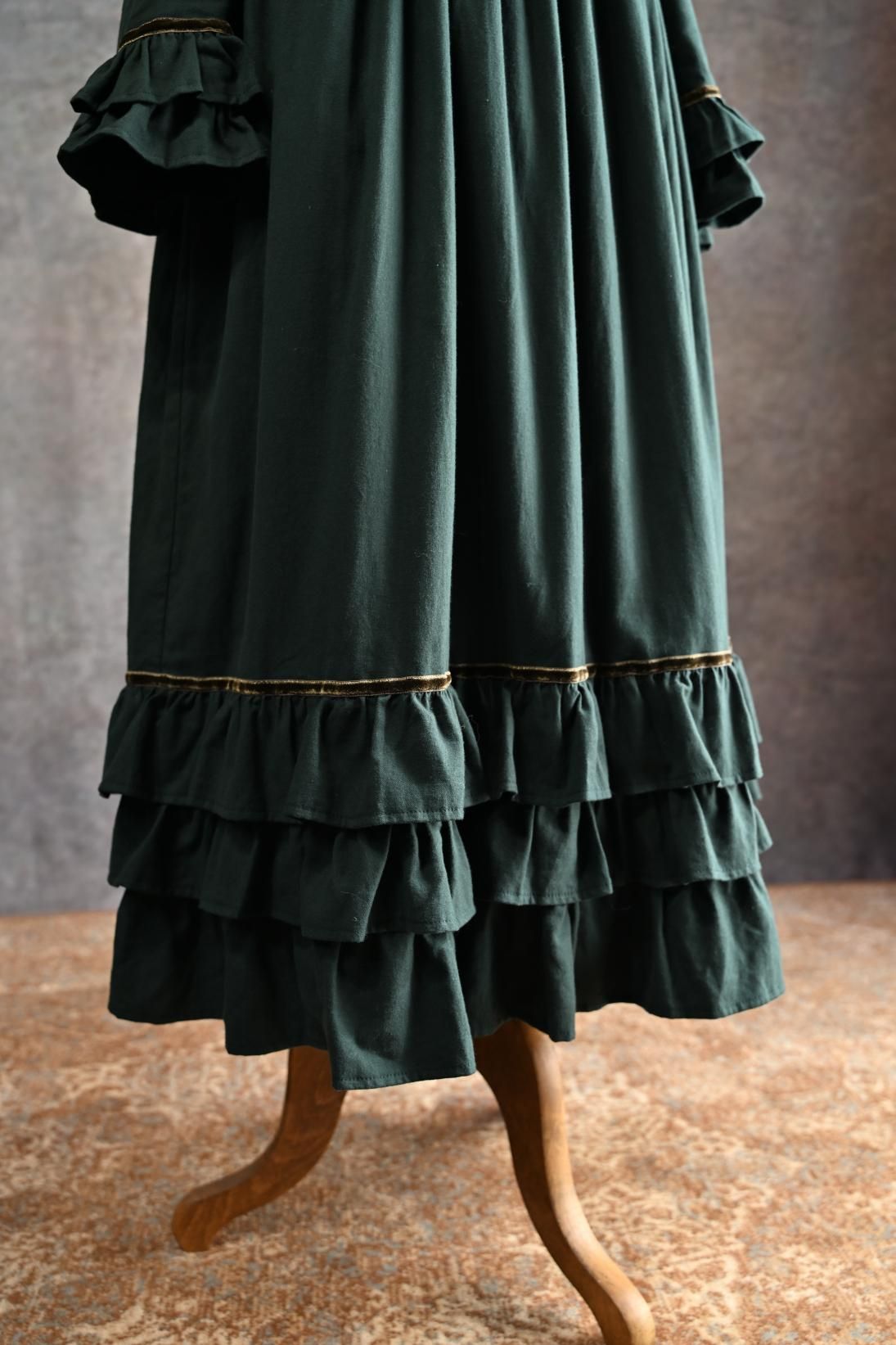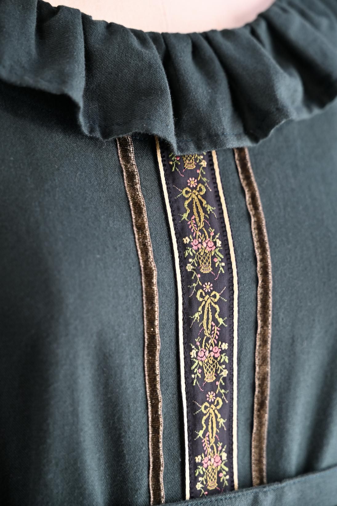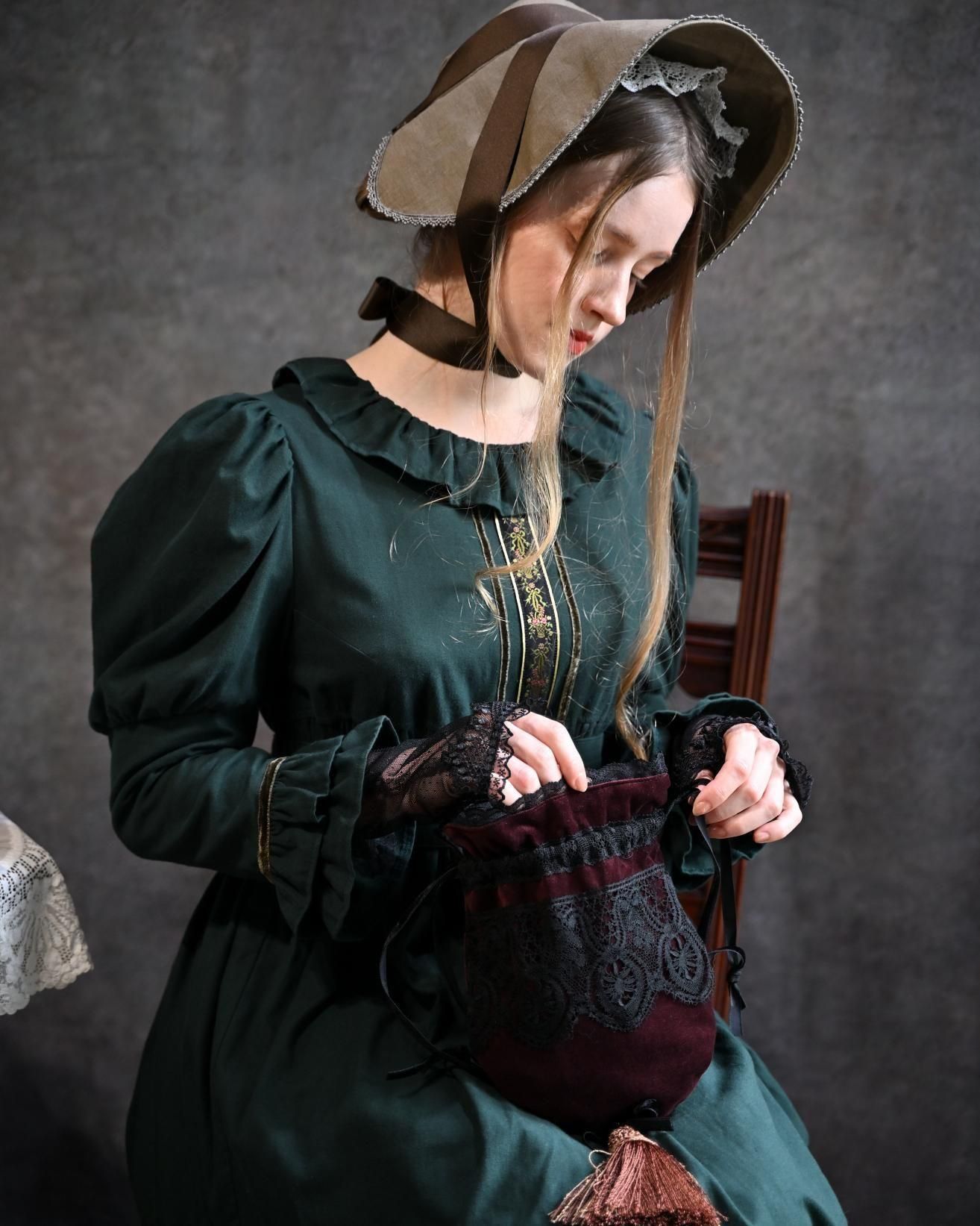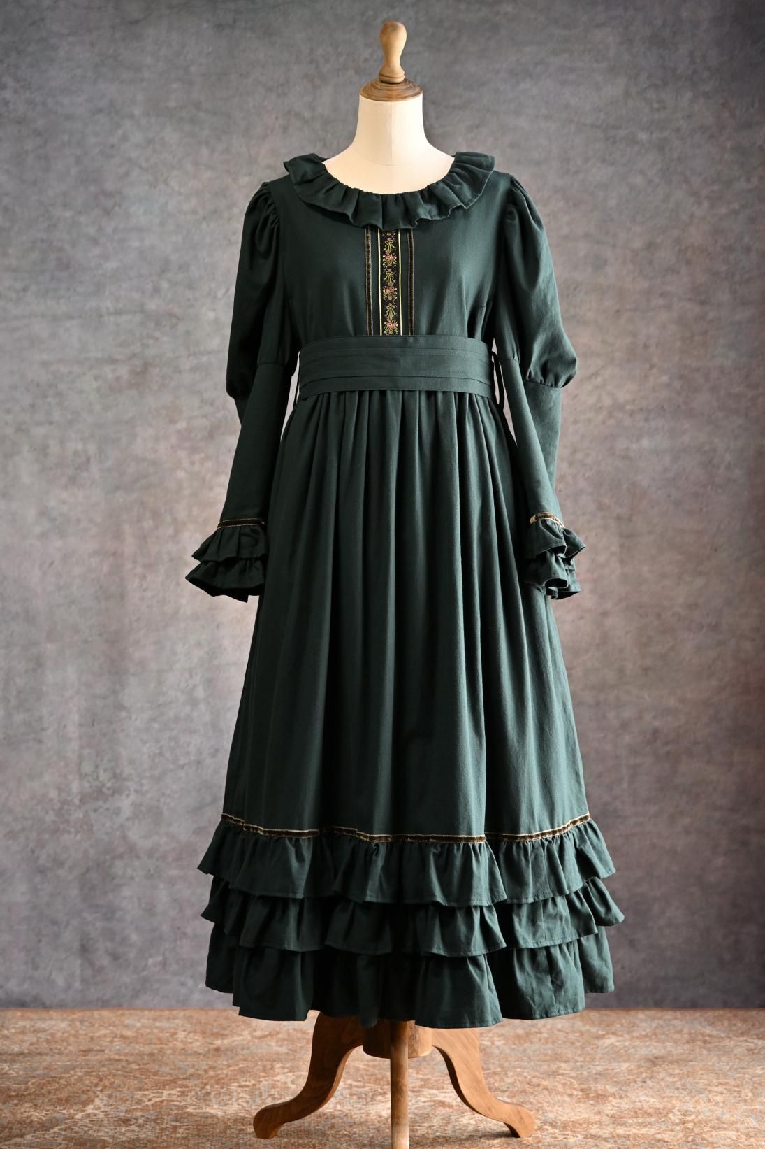 ヴィクトリア朝の画家、ケイト・グリーナウェイの描く世界と深まりゆく秋の森のイメージを重ねた合わせた物語性漂うドレス。グリーナウェイらしいハイウェストの切り替えにピンタックをほどこしたサッシュベルト、袖口に2段フリルとスカート裾には3段フリルが揺れます。深みのあるカラーに胸元の花籠柄のジャガードリボンが華やかさを添えて。軽く起毛したソフトであたたかいコットンビエラは秋冬にぴったりです。