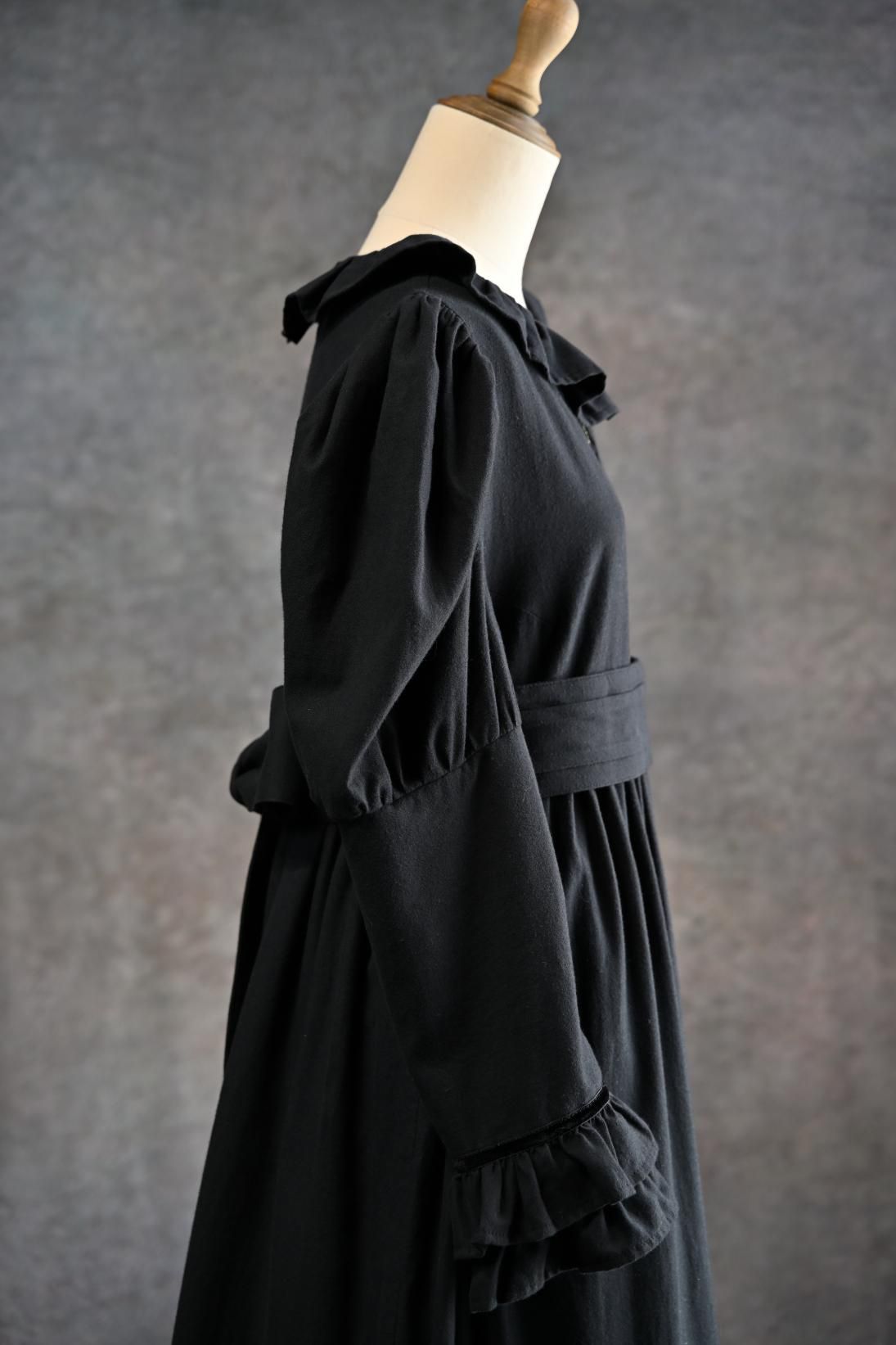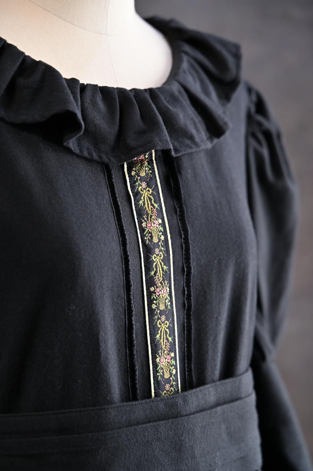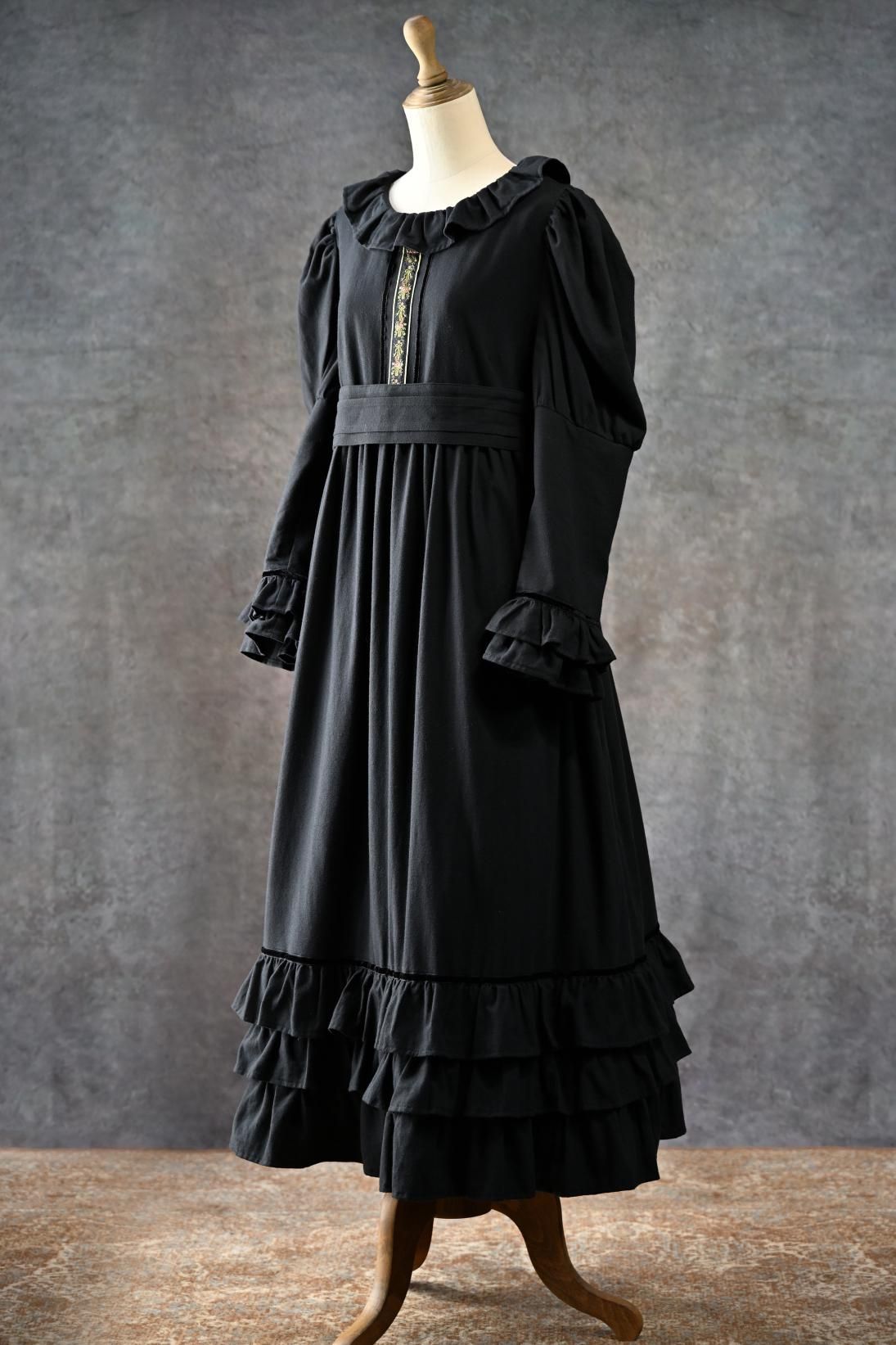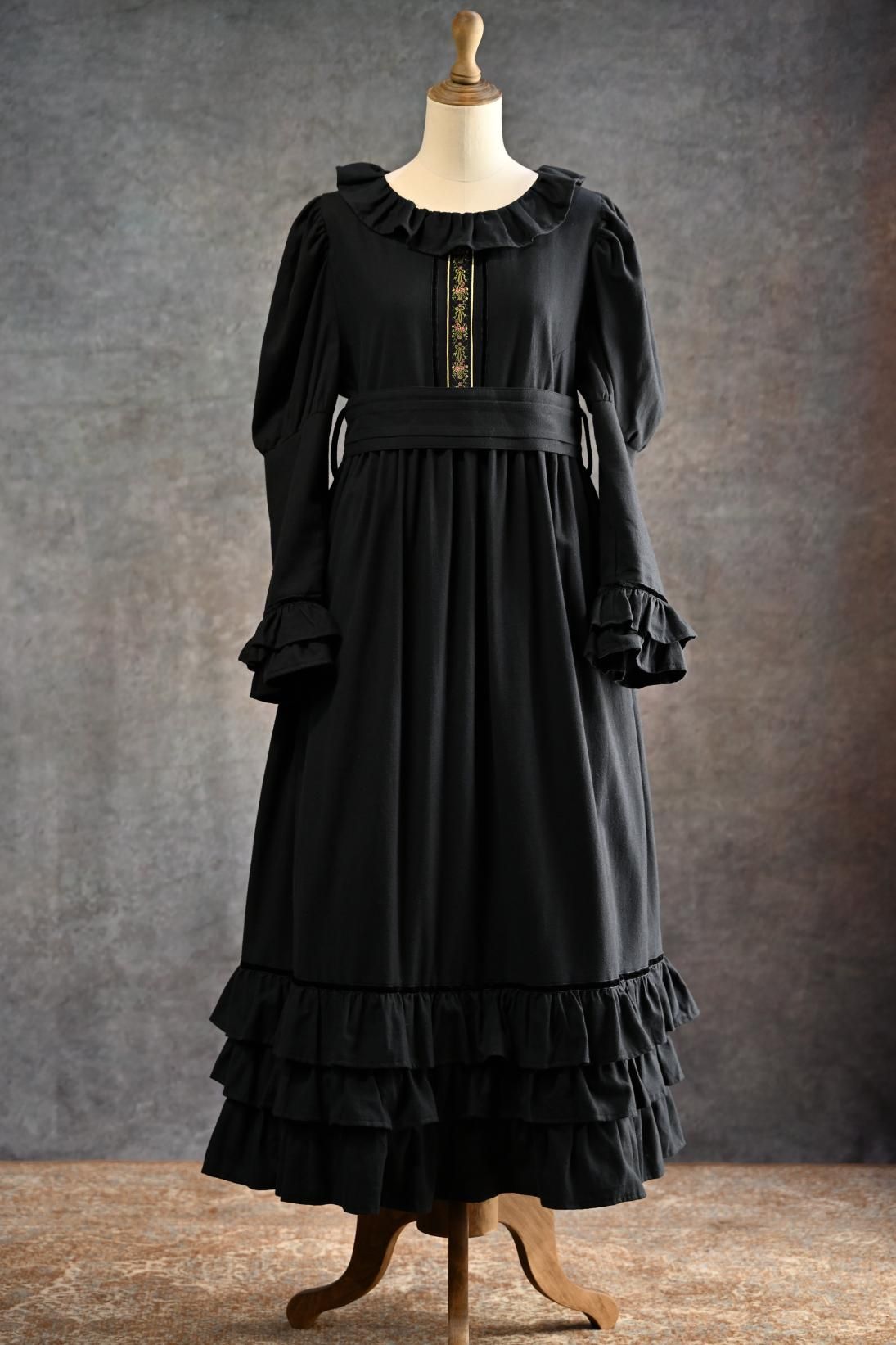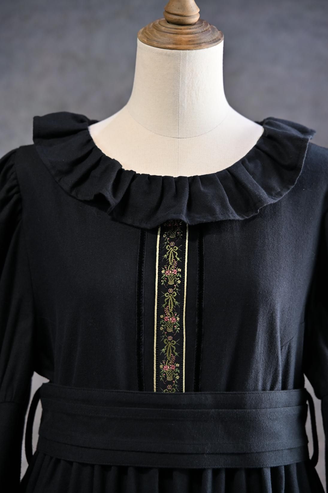 ヴィクトリア朝の画家、ケイト・グリーナウェイの描く世界と深まりゆく秋の森のイメージを重ねた合わせた物語性漂うドレス。グリーナウェイらしいハイウェストの切り替えにピンタックをほどこしたサッシュベルト、袖口に2段フリルとスカート裾には3段フリルが揺れます。深みのあるカラーに胸元の花籠柄のジャガードリボンが華やかさを添えて。軽く起毛したソフトであたたかいコットンビエラは秋冬にぴったりです。