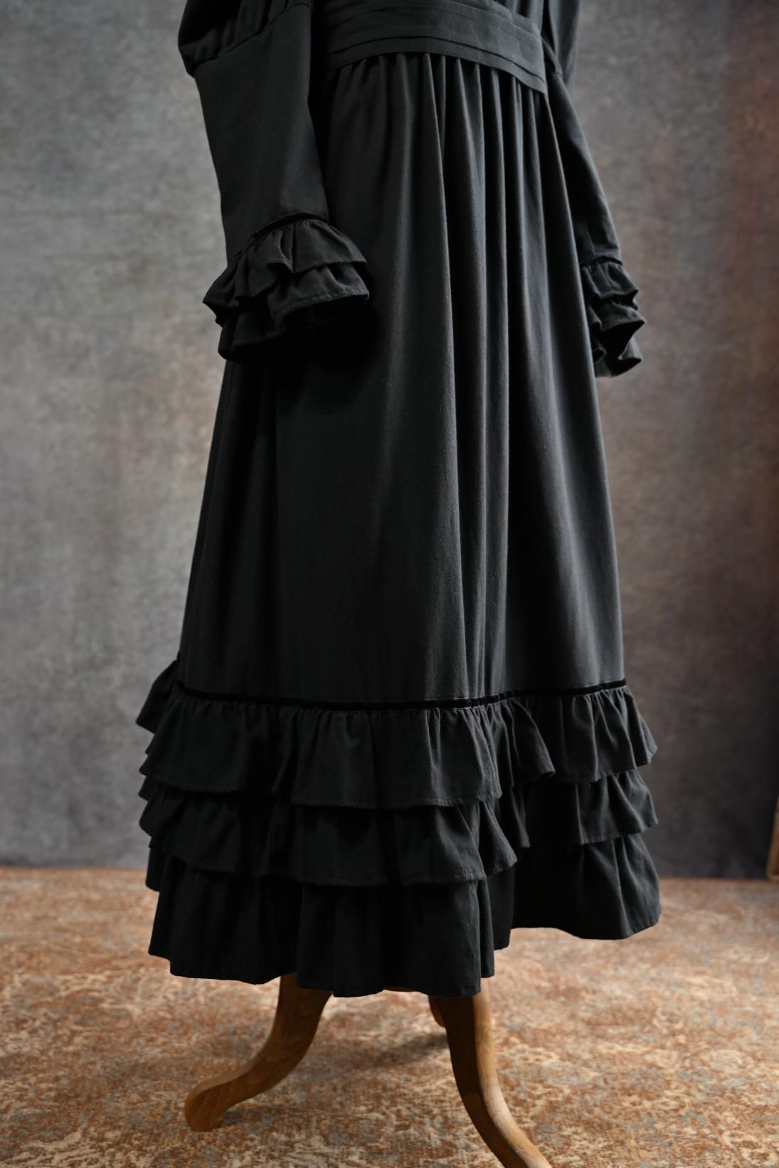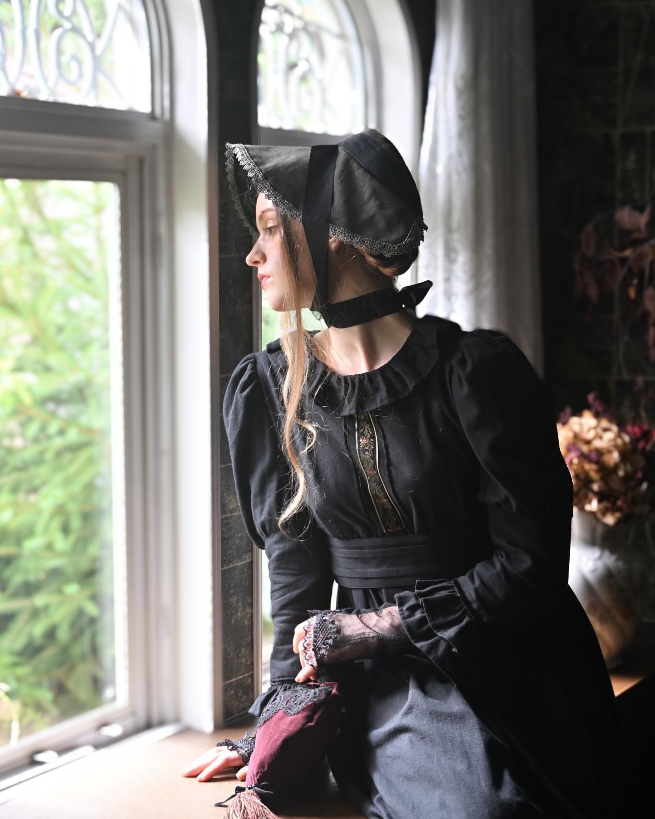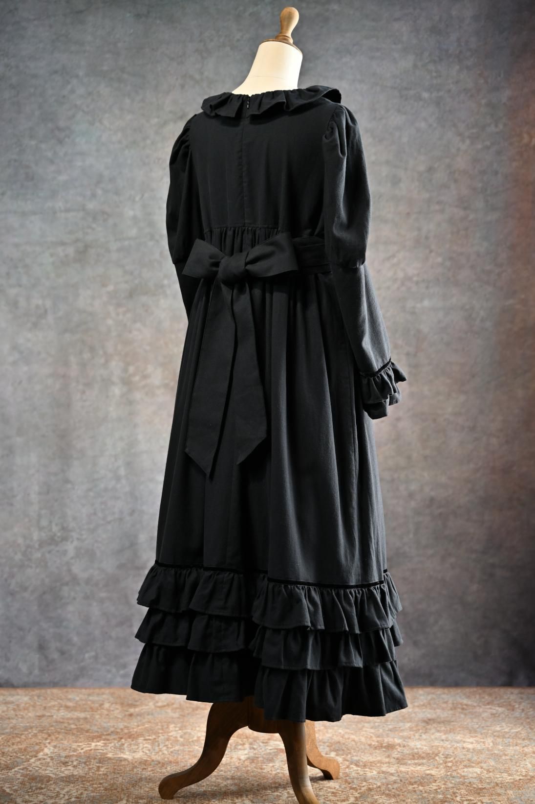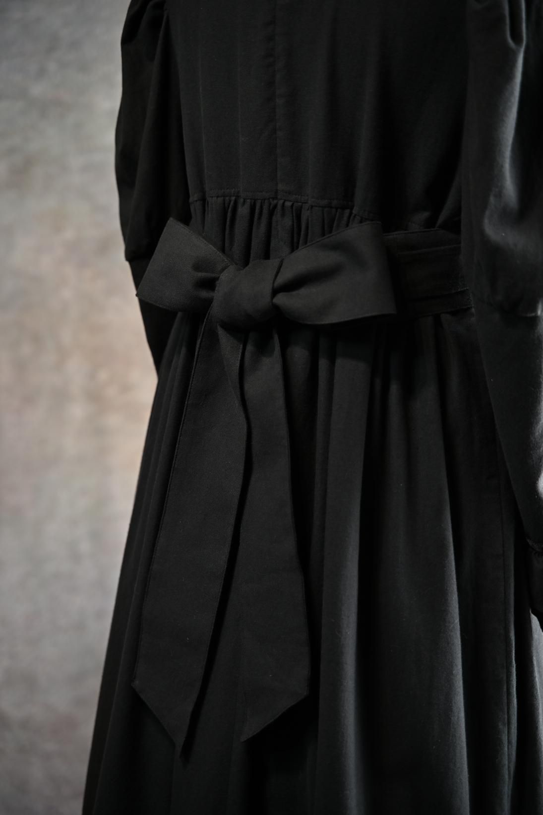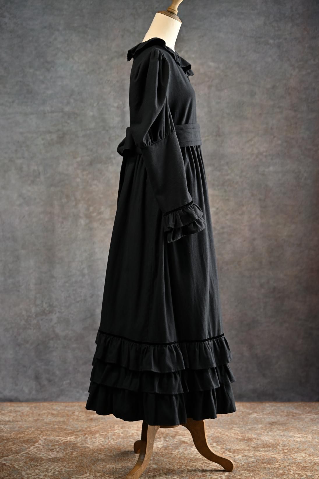 ヴィクトリア朝の画家、ケイト・グリーナウェイの描く世界と深まりゆく秋の森のイメージを重ねた合わせた物語性漂うドレス。グリーナウェイらしいハイウェストの切り替えにピンタックをほどこしたサッシュベルト、袖口に2段フリルとスカート裾には3段フリルが揺れます。深みのあるカラーに胸元の花籠柄のジャガードリボンが華やかさを添えて。軽く起毛したソフトであたたかいコットンビエラは秋冬にぴったりです。
